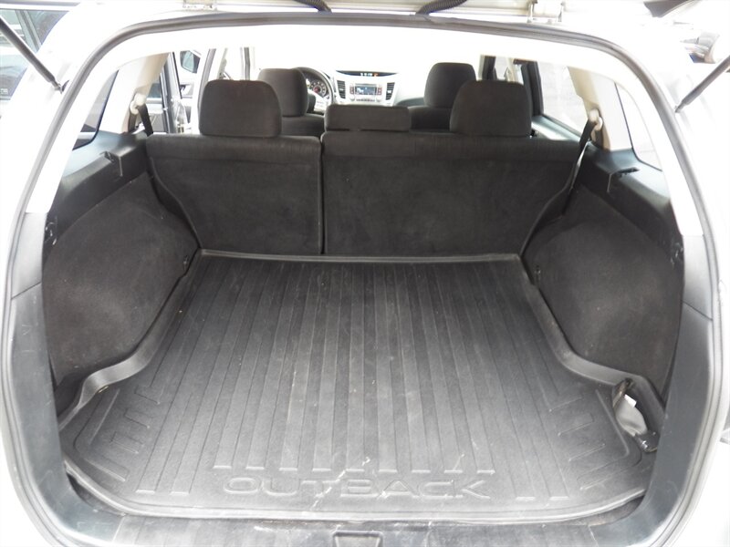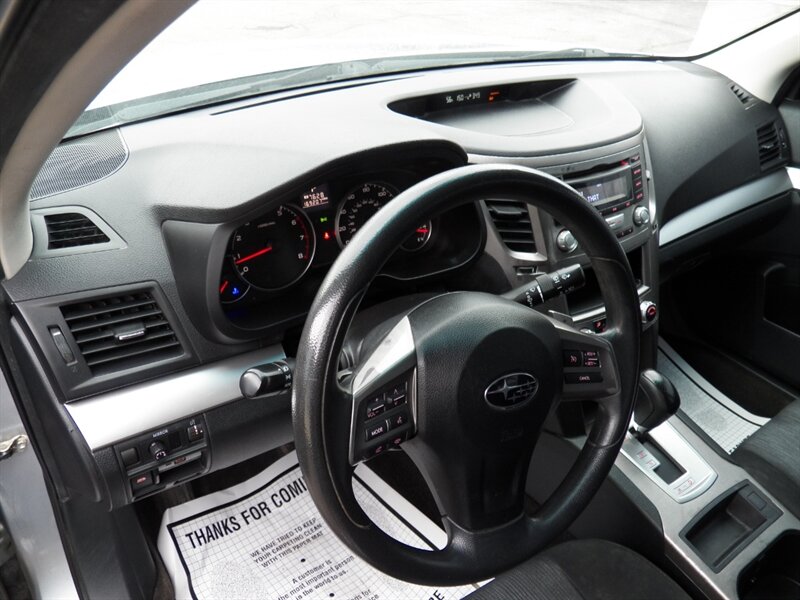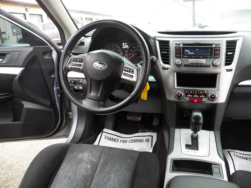 2014 Subaru Outback 2.5i AWD, powered by a 2.5-liter horizontally opposed four-cylinder, pairs Symmetrical All-Wheel Drive with an efficient drivetrain rated at 24 MPG city and 30 MPG highway. Factory-standard safety and control features include full-time AWD, traction and stability control, ABS with electronic brake-force distribution, front and side-curtain airbags, and a tire pressure monitoring system. Comfort and convenience items fitted from the factory include cloth seating, air conditioning, power windows and locks, remote keyless entry, cruise control, tilt steering, a 60/40 split-folding rear seat and roof rails; the factory audio setup provides AM/FM plus auxiliary/USB connectivity and hands-free Bluetooth phone/audio capability. This vehicle is in excellent overall condition.