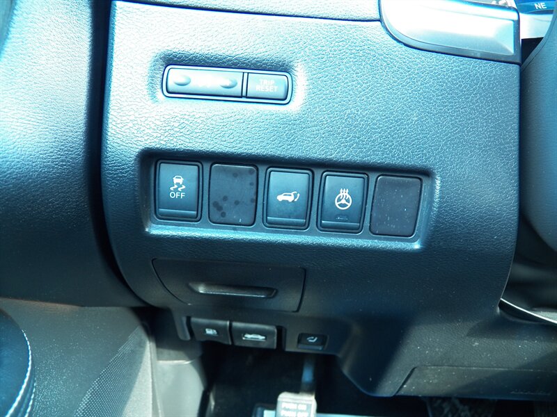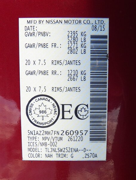 Factory Platinum equipment includes leather-appointed seating with heated front seats and power adjustments with driver memory, heated steering wheel, dual-zone automatic climate control, NissanConnect navigation with color display, Bose premium audio, Bluetooth hands-free and audio streaming, push-button start with Intelligent Key, power liftgate, Around View Monitor (360° camera) with parking sensors, blind spot warning and rear cross-traffic alert, 20-inch alloy wheels, roof rails, fog lights, and standard safety systems (ABS, stability/traction control and multiple airbags).