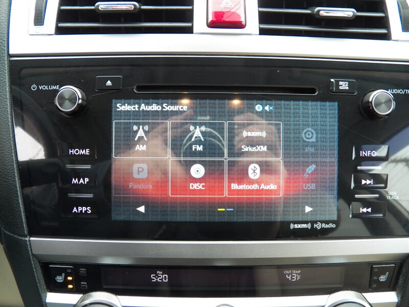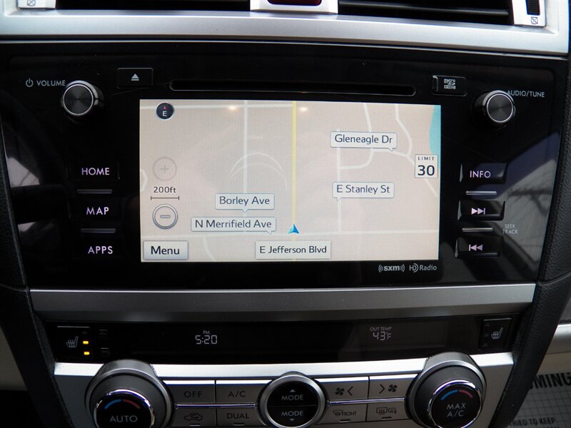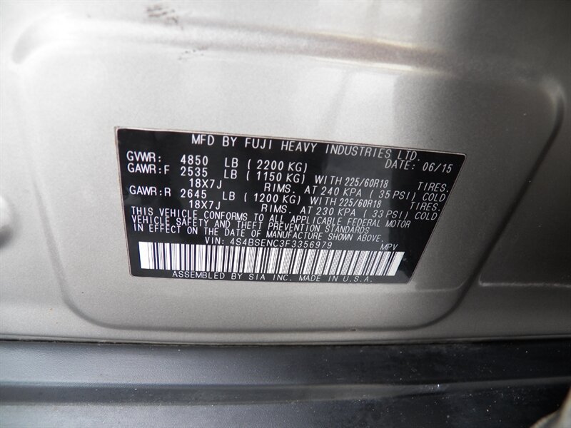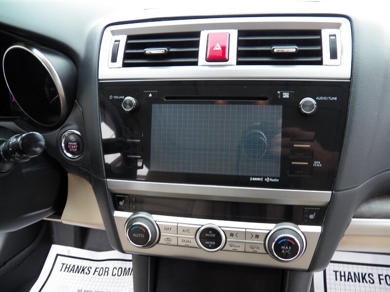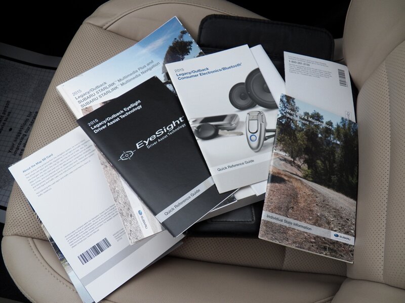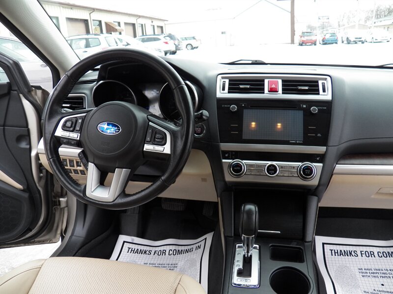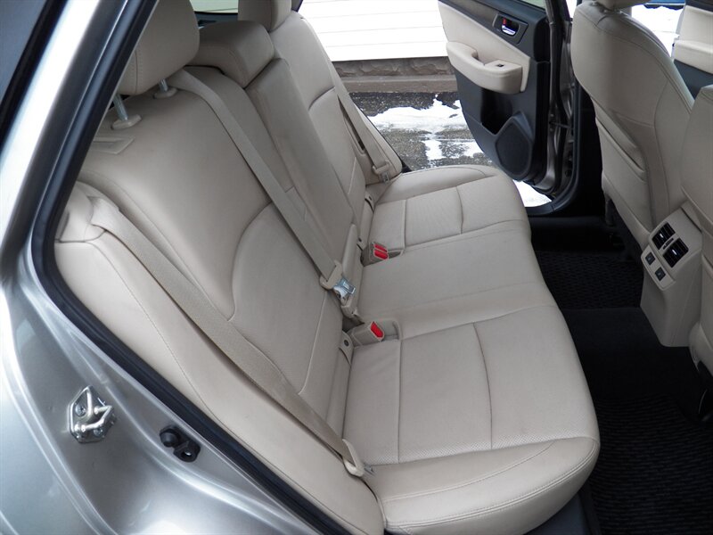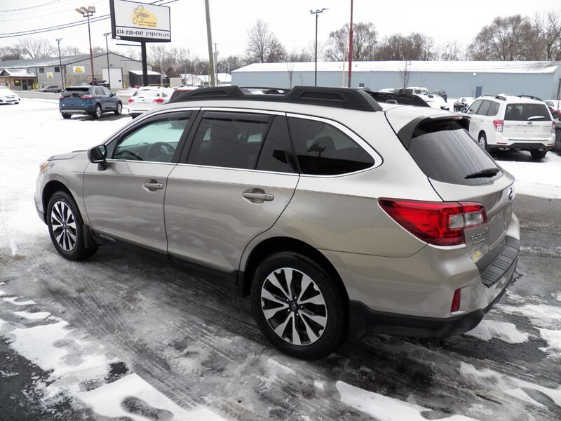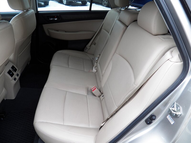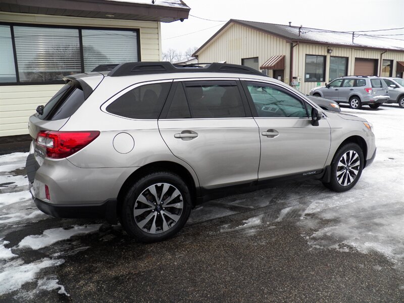 2015 Subaru Outback 3.6R Limited AWD with a 3.6L H6 (256 hp / 247 lb-ft). Factory-equipped features include Symmetrical AWD, 5-speed automatic transmission, leather-trimmed heated front seats, power-adjustable driver’s seat with memory, dual-zone automatic climate control, power moonroof, roof rails with integrated crossbars, alloy wheels, fog lights, rearview camera, Subaru Starlink audio with Bluetooth, USB/AUX inputs and steering-wheel controls, keyless entry with push-button start, cruise control, and full safety suite (ABS, traction and stability control, multiple airbags, tire pressure monitoring). Below 91,000 miles (averaging under 8,000 miles/year), rated about 20 MPG city / 27 MPG highway, and in excellent overall condition.
