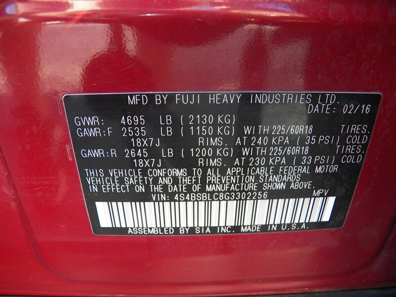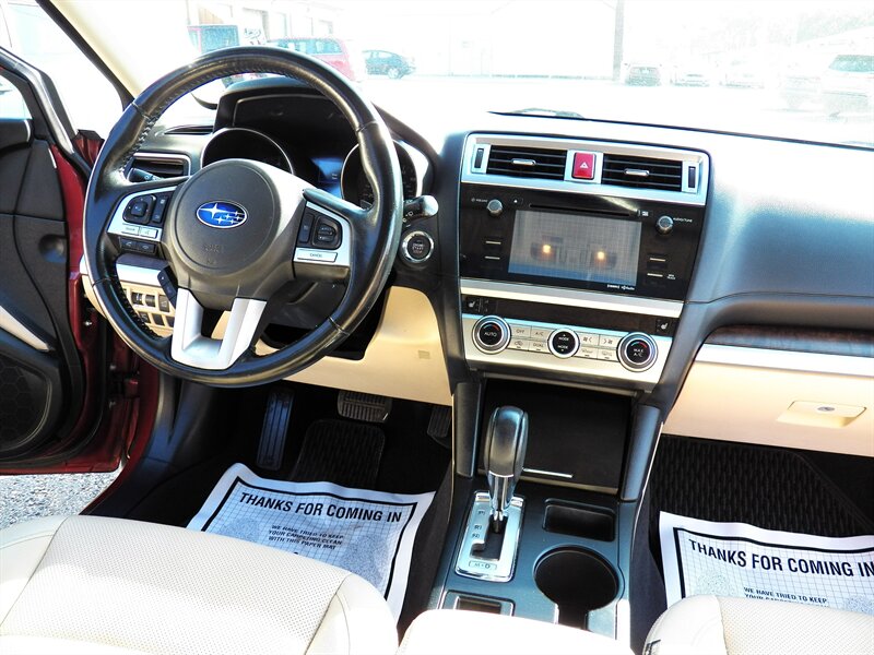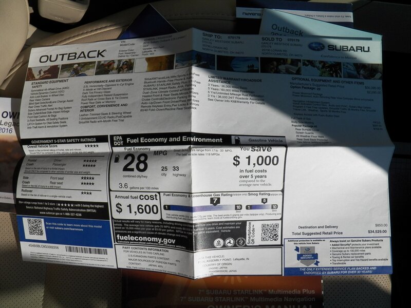 The 2016 Subaru Outback 2.5i Limited AWD comes equipped with a 2.5L H4 engine generating 175hp and 174ft. lbs. of torque. This model boasts factory default features including a power panoramic moonroof, leather-trimmed upholstery, dual-zone automatic climate control, a 7-inch touchscreen infotainment system with navigation, Harman Kardon premium audio system, heated front and rear seats, a power liftgate, and Subaru's EyeSight Driver Assist Technology. With a fuel efficiency of 25 MPG in the city and 33 MPG on the highway, this Outback is in excellent overall condition.