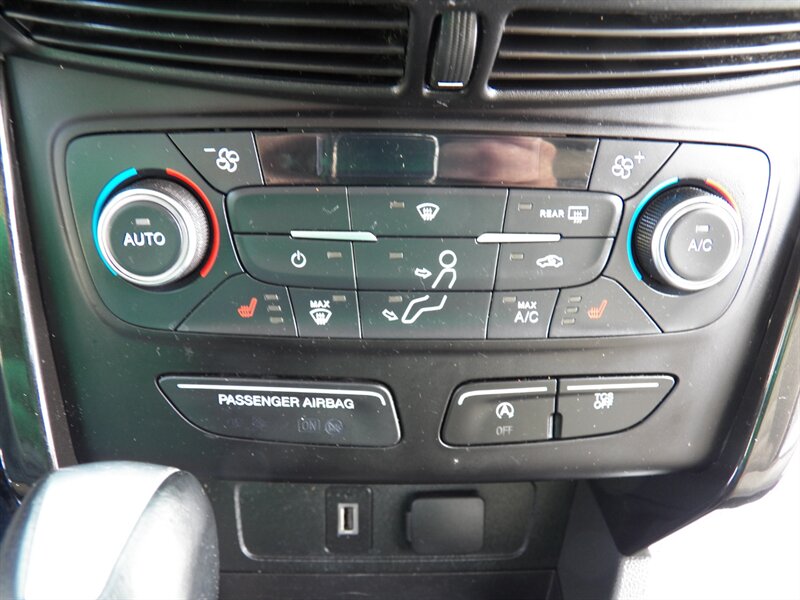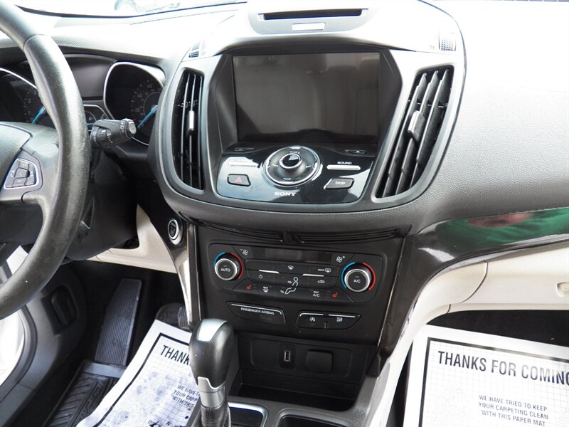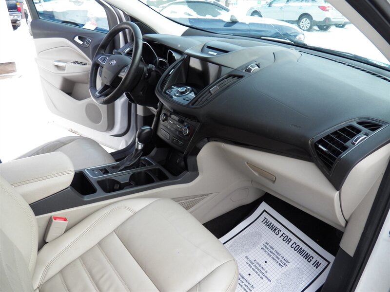 2017 Ford Escape Titanium with the 2.0L EcoBoost four-cylinder — excellent overall condition and rated about 22 MPG city / 29 MPG highway. Factory-equipped Titanium features typically include leather-trimmed seating with heated front seats and power adjustments, dual-zone automatic climate control, keyless entry with push-button start and remote start, a touchscreen infotainment system with smartphone integration and premium audio, rearview camera, blind-spot monitoring with rear cross-traffic alert, and a six-speed automatic transmission (FWD standard, AWD available). Standard safety and convenience items include multiple airbags, ABS, stability and traction control, and parking sensors.