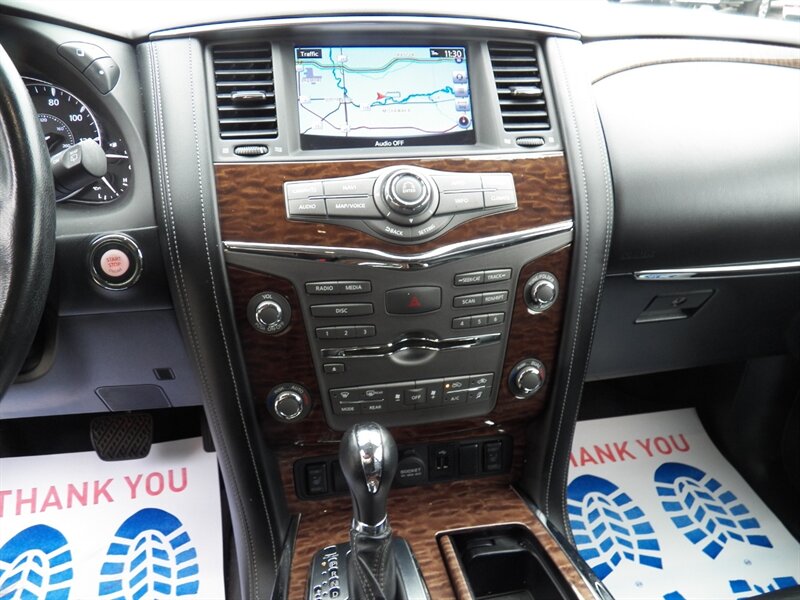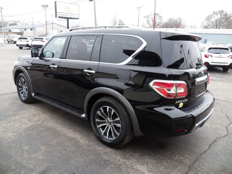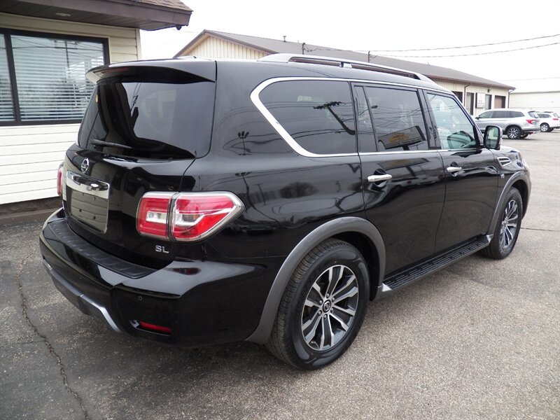 2020 Nissan Armada SL 4x4 with a 5.6L V8 producing 390 hp and 394 lb-ft of torque, paired with a 7-speed automatic and four-wheel drive; EPA-rated at 13 MPG city and 18 MPG highway. Factory equipment on the SL includes leather-appointed seating with heated and ventilated front seats, power-adjustable driver’s seat with memory, tri-zone automatic climate control, power moonroof and power liftgate, keyless entry with push-button start, NissanConnect with navigation on an 8-inch display, Bose premium audio, Apple CarPlay/Android Auto, Bluetooth and multiple USB ports, 20-inch alloy wheels and roof rails. Standard safety and convenience items include a rearview camera, parking sensors, blind-spot warning, rear cross-traffic alert and forward emergency braking. Vehicle is in excellent overall condition.